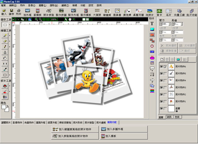 可以製作寫真書、撲克牌、名片、賀卡、桌曆、月曆、沖洗照片、大頭照、縮圖頁,與 添加文字 、小圖案 、外框 、對話框等等常見有趣的應用。